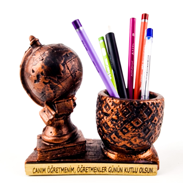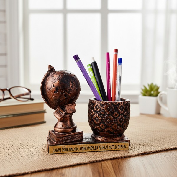 Üzerinde yer alan “Canım Öğretmenim, Öğretmenler Günün Kutlu Olsun” yazısı, ürüne duygusal bir anlam katar ve her bakıldığında öğretmenlerin yüzünde tebessüm oluşturur.Kaliteli reçine malzemeden üretilen bu kalemlik, hem dayanıklı yapısı hem de antik bronz tonlarındaki rengiyle masaüstüne nostaljik bir dokunuş kazandırır.
