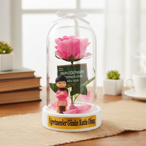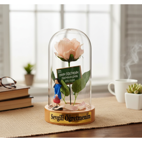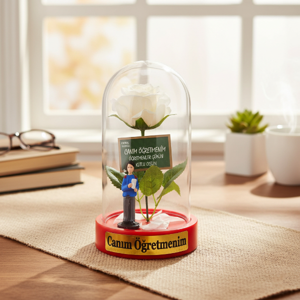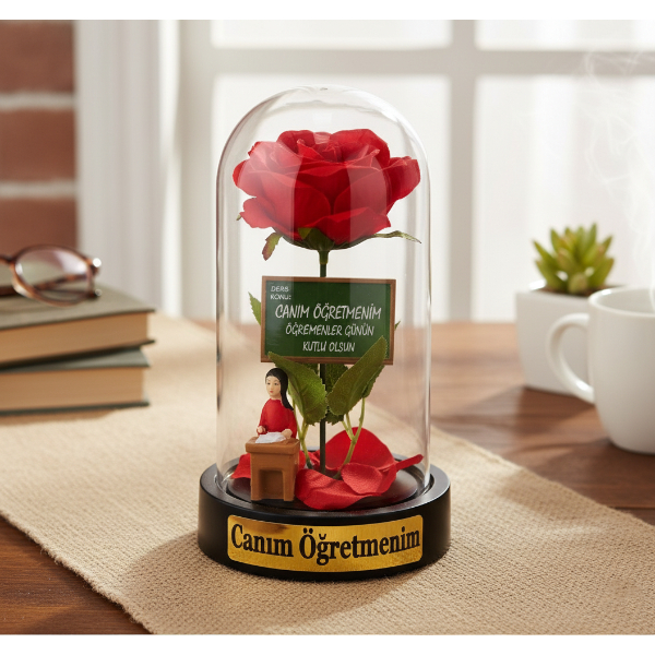 10x18 cm ölçülerindeki bu zarif fanus, içinde yer alan renkli yapay gül, minyatür öğretmen figürü ve “Canım Öğretmenim”, “Sevgili Öğretmenim”, “Öğretmenler Günün Kutlu Olsun” gibi anlamlı yazılarla tamamlanmıştır.Fanusun alt kısmında farklı renkli tabanlar ve içerisindeki detaylarla her biri kendine özgü bir görünüm sunar.