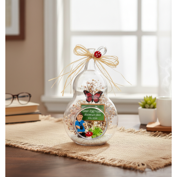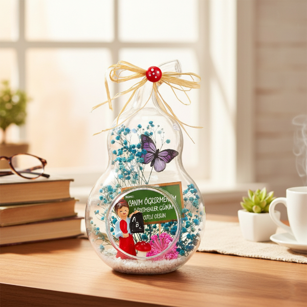 13x13x21 cm ölçülerindeki bu özel teraryum, armut formundaki şeffaf fanus yapısı ve içerisindeki detaylı figürleriyle estetik bir görünüm sunar.Fanusun içinde yer alan renkli kuru çiçekler, minyatür öğretmen ve öğrenci figürleri ile “Canım Öğretmenim - Öğretmenler Günün Kutlu Olsun” yazılı tabela yer alır.