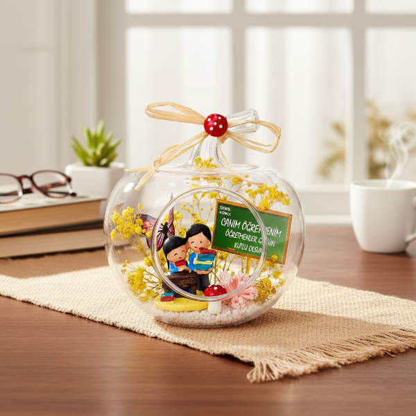 13x13x16 cm boyutundaki bu elma biçimli teraryum, içerisinde yer alan renkli kuru çiçekler, minyatür öğretmen figürü ve “Canım Öğretmenim” temalı tabela detayı ile şık bir görünüm sunar.Şeffaf elma formundaki fanus, iç detayların net şekilde görülmesini sağlar ve dekoratif olarak her ortama zarif bir hava katar.