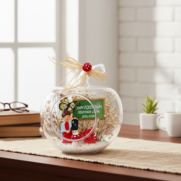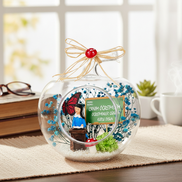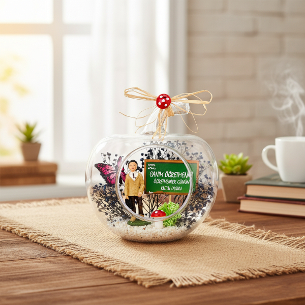 Zarif ve anlamlı tasarımıyla öne çıkan Mini Elma Teraryum, Öğretmenler Günü için hazırlanmış özel bir dekoratif hediye alternatifidir.