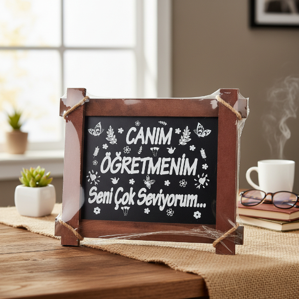 32x27x2 cm ölçülerindeki bu dekoratif pano, ahşap çerçeve yapısı ve siyah zemin üzerine beyaz yazı baskısıyla estetik bir görünüm sunar.Panonun üzerinde “Canım Öğretmenim, Öğretmenler Günün Kutlu Olsun” veya “Canım Öğretmenim, Seni Çok Seviyorum” yazıları bulunur.