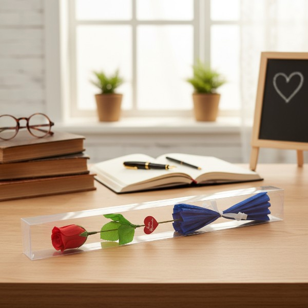 5x6x40 cm ölçülerindeki bu özel ürün, şeffaf kutu içinde yer alan krapon kağıdıyla süslenmiş kırmızı yapay gülden oluşur.