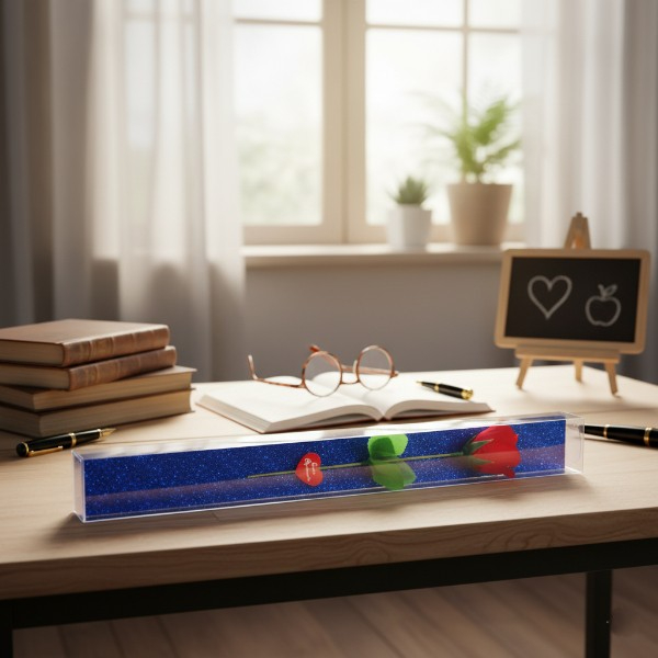 5x6x40 cm boyutlarında olan bu özel gül, simli şeffaf kutu ambalajı sayesinde ışığı yansıtarak ışıltılı bir görünüm sunar.Kutunun içinde yer alan kırmızı yapay gül, kalp detaylı etiketinde “Canım Öğretmenim” yazısıyla anlamlı bir mesaj taşır.