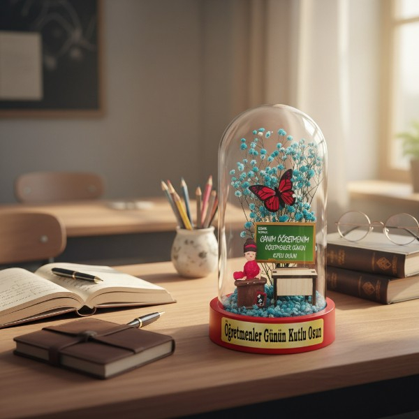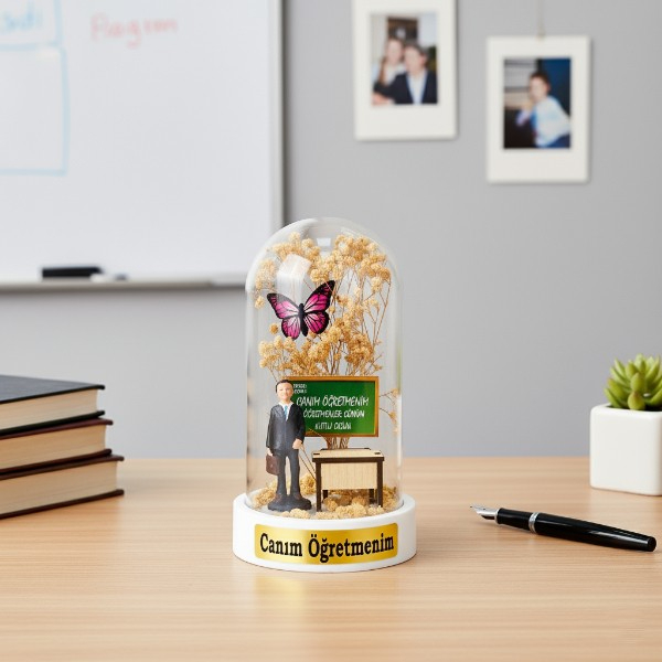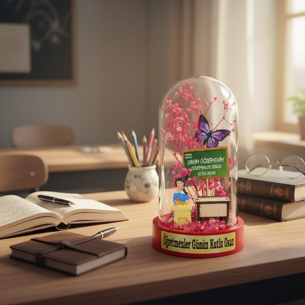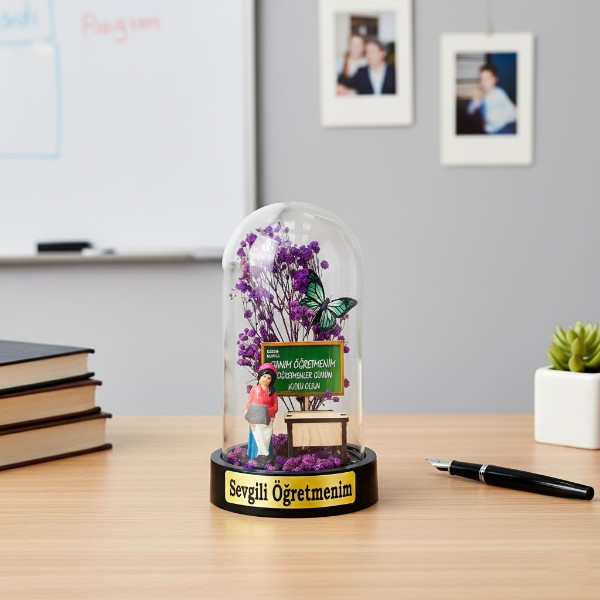 10x18 cm ölçülerindeki bu özel dekoratif ürün, fanus içinde yer alan öğretmen figürü, masa detayları, renkli ağaç süsleri ve kelebek figürleriyle tamamlanmış estetik bir görünüme sahiptir.Her modelin üzerinde “Canım Öğretmenim”, “Sevgili Öğretmenim” veya “Öğretmenler Günün Kutlu Olsun” gibi anlamlı yazılar yer alır.