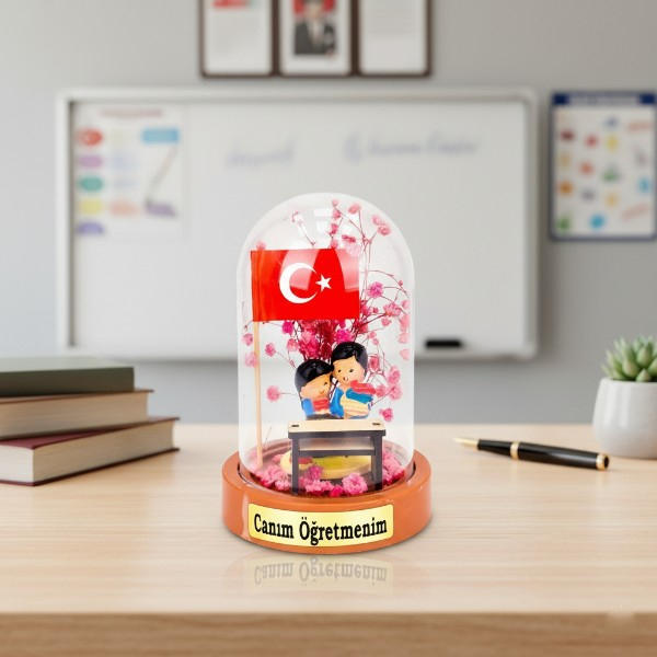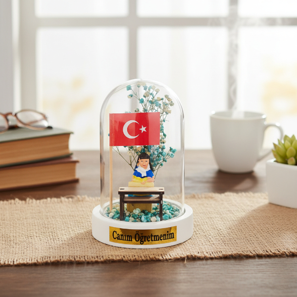 9x13 cm ölçülerindeki bu özel ürün, içerisinde minyatür öğretmen figürü, masa detayı, renkli çiçek süsleri ve Türk bayrağıyla tamamlanmış estetik bir fanus tasarımına sahiptir.Her bir modelin ön kısmında “Canım Öğretmenim”, “Sevgili Öğretmenim” veya “Öğretmenler Günün Kutlu Olsun” gibi anlamlı yazılar yer alır.