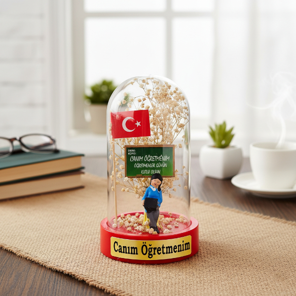 10x18 cm boyutundaki bu özel fanus, içerisinde minyatür öğretmen figürü, renkli kuru çiçekler, masa detayı ve Türk bayrağıyla tamamlanmış etkileyici bir kompozisyona sahiptir.Her modelin üzerinde “Canım Öğretmenim”, “Sevgili Öğretmenim” veya “Öğretmenler Günün Kutlu Olsun” gibi anlamlı ifadeler yer alır.
